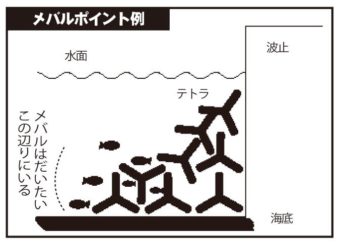 メバルは潮通しがよい所で、岩陰やテトラ際、ステ石のかけ上がりなど、身を隠せるような場所がある所に多くいる。その反面、港内奥の街灯下などにもいる。