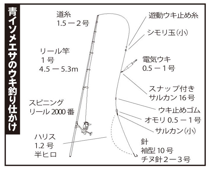 リール竿の1号4.5~5.3mで、スピニングリールの2000番に、道糸は2号、ハリスは1.2号を半ヒロ。針は袖型10号か、チヌ針の2、3号。電気ウキは0.5~1号。玉ウキ系の0.5号でもよい。