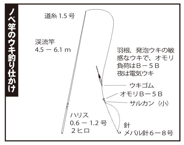 ノベ竿のウキ釣り仕かけは、道糸1.5号、ハリスは日中は0.6号、夜は1号か1.2号。ウキはなるべく敏感な棒ウキで、オモリ負荷Bから5Bぐらいまで。針はメバル針の6、7、8号。