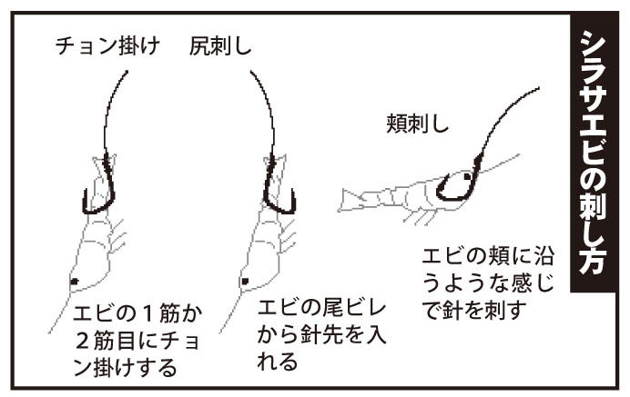エビの刺し方は、頬掛けか尾の付け根から針先を入れて、2節目ぐらいに出す(腹側に)。あるいは、チョン掛けにする。
