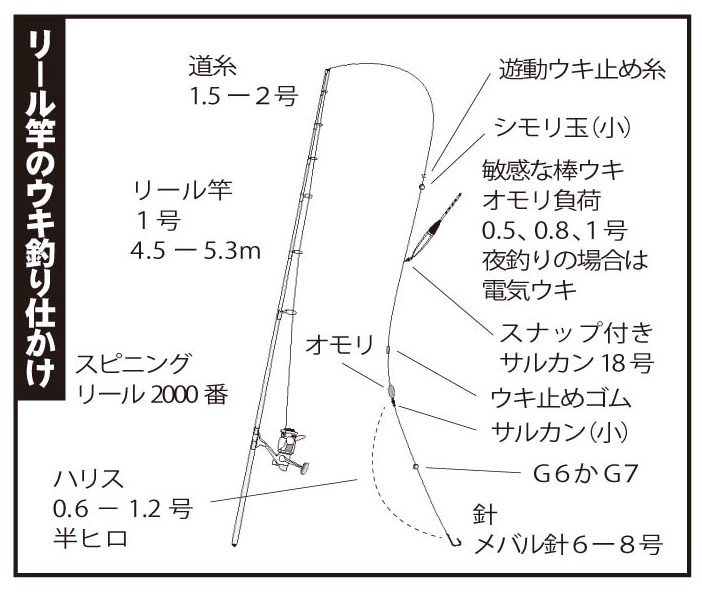 日中にリール竿で釣る場合は、深ダナで釣ることが多いので、ウキは0.5、0.8、1号ぐらいを使う。
