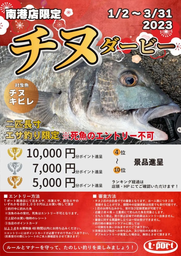 そんなチヌ釣り師たちが、こぞって訪れる釣具店「Tポート南港店」で3月31日締め切りのチヌダービーが開催中です。