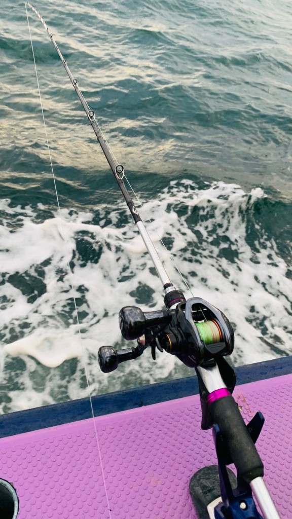 そしてロープロ系の手巻きベイトリールを使用しているメリットは、何より軽くて握りやすいことです。誘い続けるこの釣りでは、軽さが何より重要だと思っています。