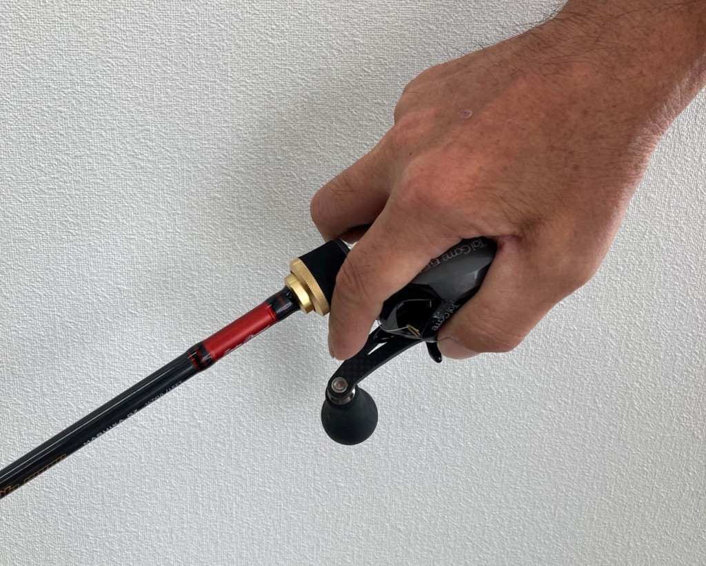 しかしながら一方で、タタキやすさや穂先に対する見やすさなどを重視し、リールを斜めに構える方もいると思う。そうした場合でも角度調整できるので、あらゆるパーミングでもティップガイドは必ず下向くようにできるのです。