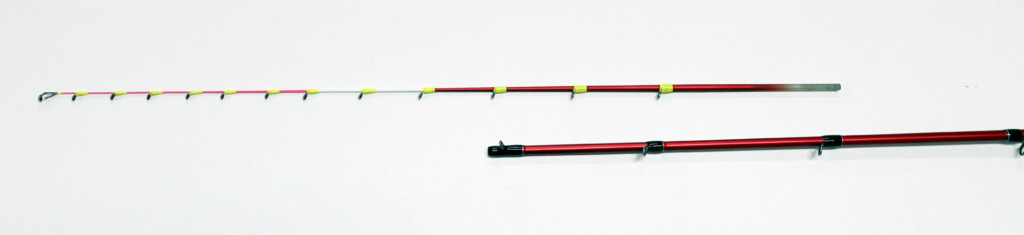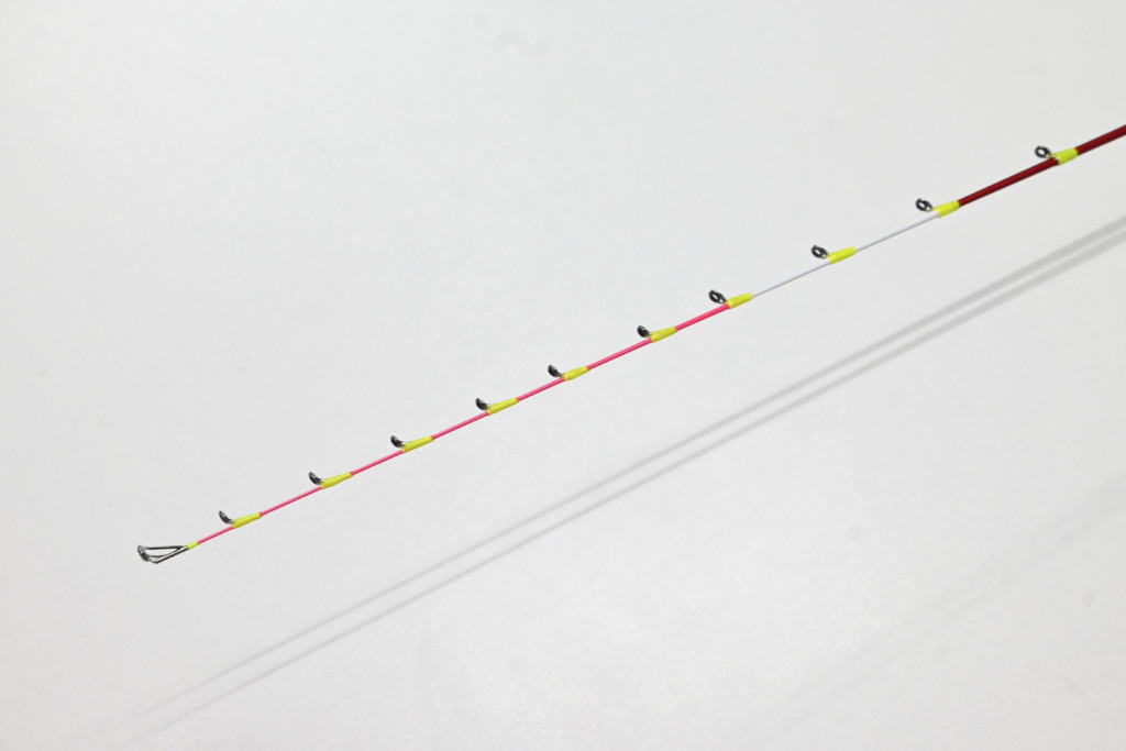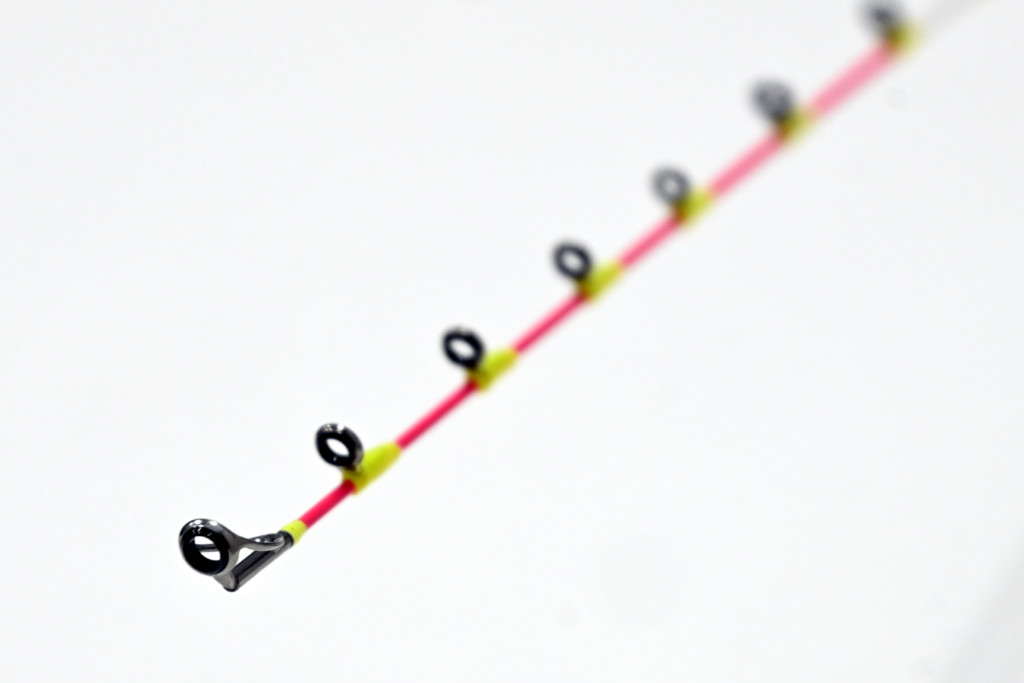このピンクペイントされた部分のガイドはチタンフレーム・トルザイトリングガイド。軽く感度に優れたガイド設定とすることで反響感度面でも底上げしています。