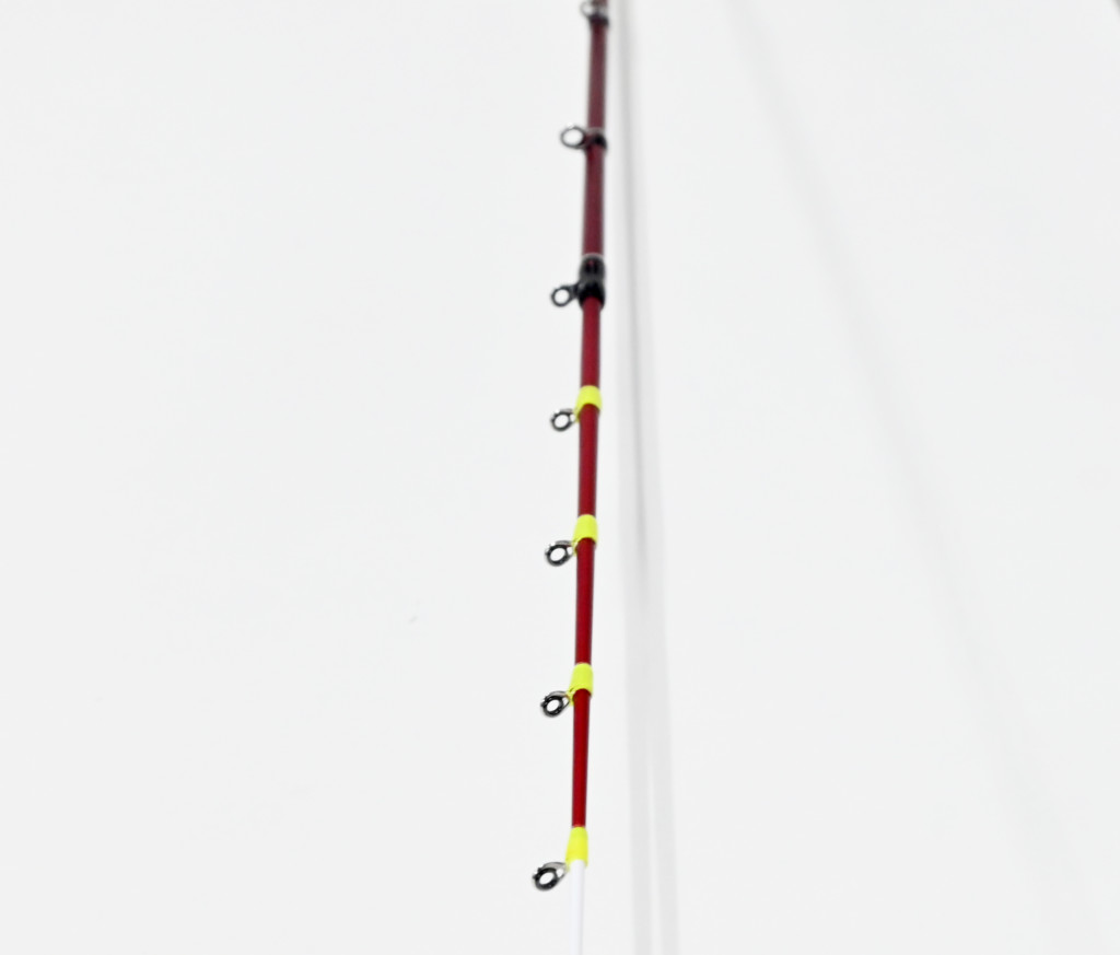 これにも意味がある。チタン穂先は確かにグラス穂先よりも若干感度に勝るが、やや重い。もともと繊細で軽量なマルイカ竿だけに穂先の重さは、思った以上に感じる。そこで軽いグラスソリッド穂先を採用したそうだ。