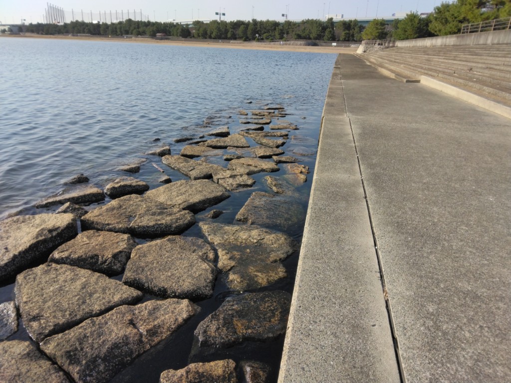 甲子園浜橋を南へ渡って左すぐの駐車場から4、5分も歩けば、1段低いステ石の石畳状の釣り場が広がる。甲子園浜橋から西側はヨットハーバーで釣りができないが、同橋から東一帯が海浜公園で釣りができる。