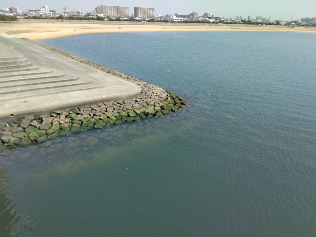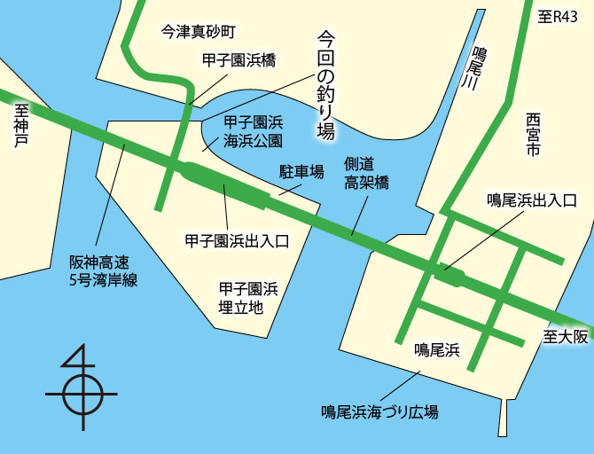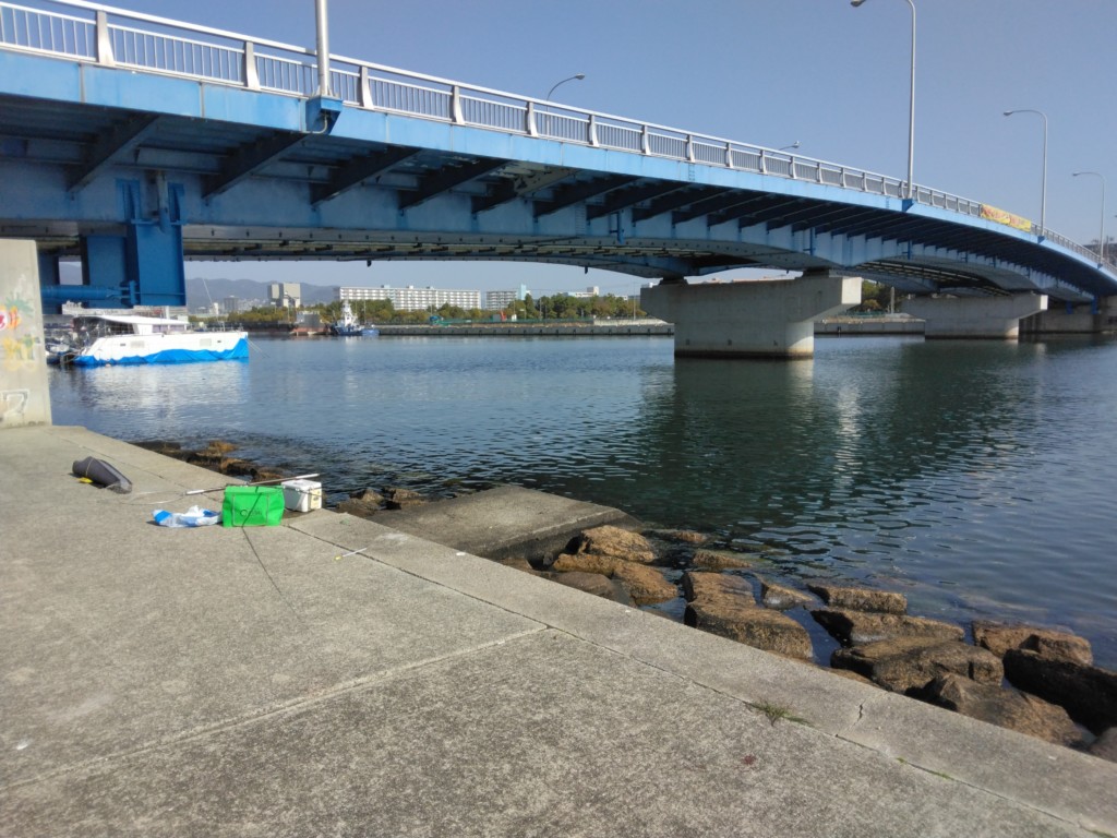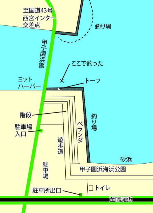 ここは甲子園浜海浜公園の一角で、西宮今津から甲子園浜の埋立地へ渡る橋(甲子園浜橋)の両岸から東側一帯が釣り場で、周囲を陸で囲まれた波静かな所。