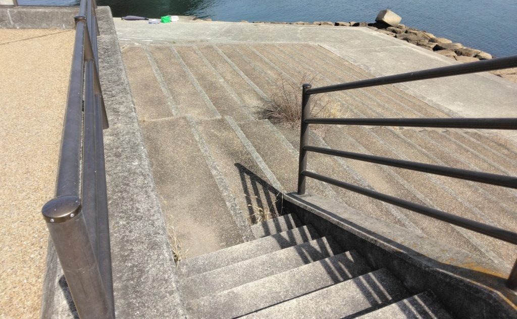 この付近は石畳状のステ石が一帯に入っている。曲がり角近くから南の方のステ石は、潮位の高さにもよるが、満潮時は水没することもあるので、要注意。