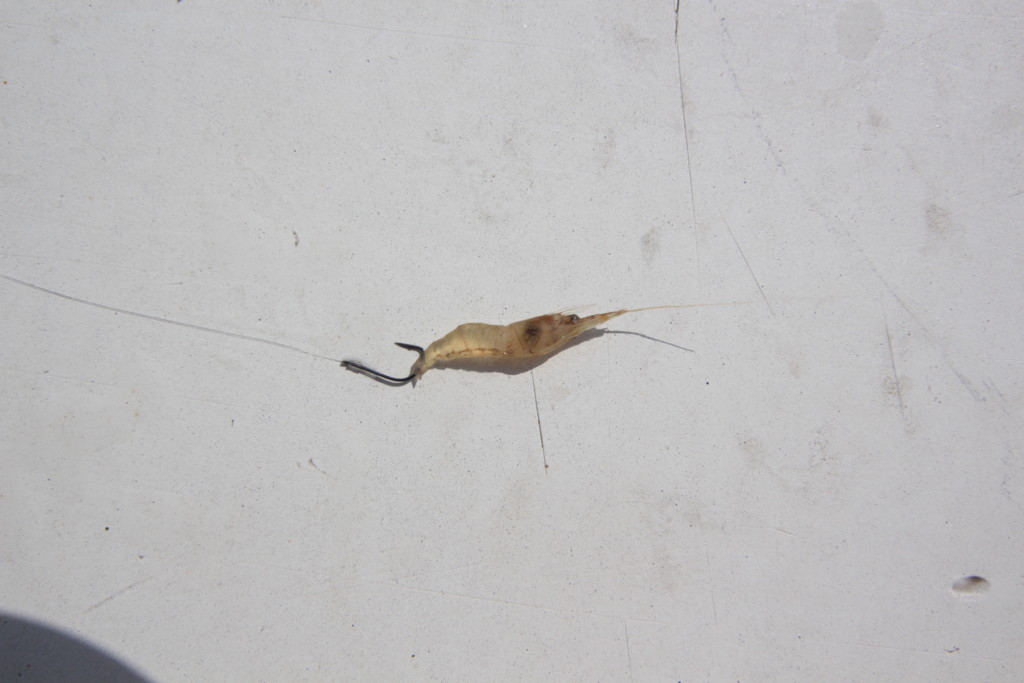 胴突き仕かけでは、船で配られるシラサエビをサシエにする。配られるシラサエビのサイズは、大小まじっているが、エサ選びが釣果を伸ばすカギとなる。無意識にエビを掴んで針に付けるのではなく、エサは、中型以下の小さいエビを選ぶことが大切。