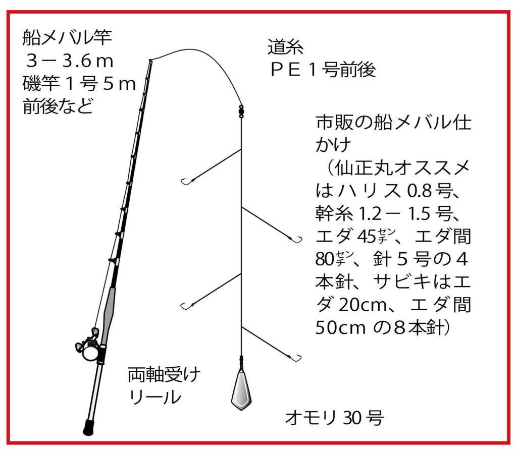 タックルは船メバル専用竿がよいが、中乗りの山田氏は、慣れている人なら、0.6号程度の磯竿がオススメとのこと。ビギナーは、仕かけのトラブルが少ない中通しタイプが扱いやすい。