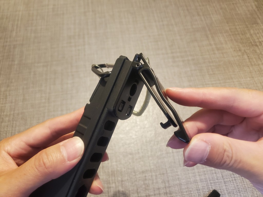 このベルトフックが衣服の腰ベルトであったり、バッグのベルトなどに差し込むことで装着が可能となっています。