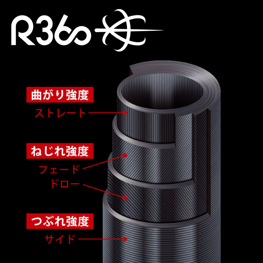 R360構造とは、カーボン繊維の向きを、縦、右斜め、左斜め、横の4方向に配置することで、360度方向の力に対応することが可能となったブランクス製法。先述した、高強度・高弾性な東レT1100Gカーボンと非常に相性がよく、高弾性ながら非常にしなやかなブランクスに仕上げることができているそう!