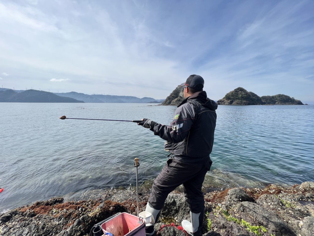 マキエをポイントへ打つ、大向氏。マキエを狙った所へ打てるかも釣果を伸ばすひとつのカギとなる