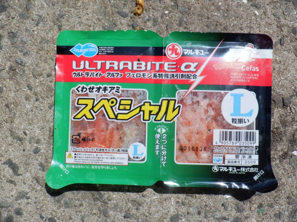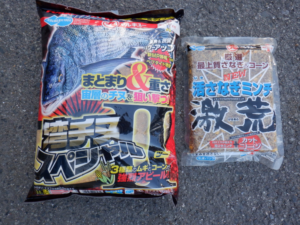 マキエはオキアミ3kgとマルキユー湾チヌスペシャルⅡに、ニュー活さなぎミンチ激荒を各1袋まぜた。サシエはくわせオキアミスペシャルL