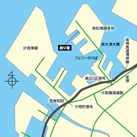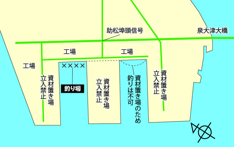 ここは泉大津大橋を渡って、人工島に入って2つ目の信号(助松埠頭)で左折。突き当たりの左右に同様の長方形の入り江状の岸壁がある。