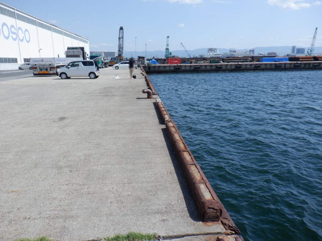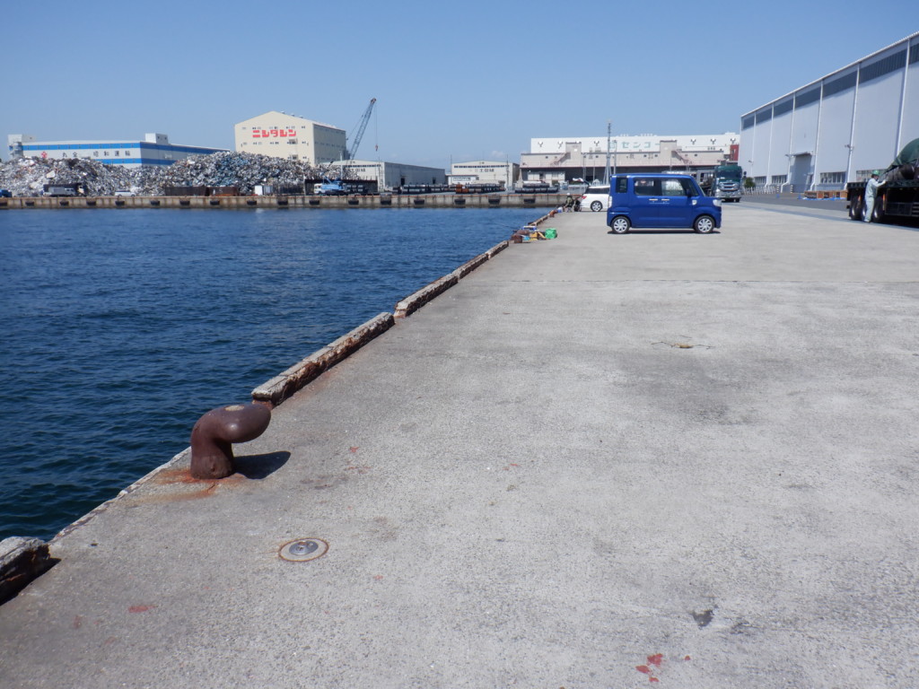 左の方の岸壁は資材が置かれ、トラックが出入りしているので釣りができないが、右の方の岸壁は、貨物船が着岸してさえいなければ、釣りが楽しめる。