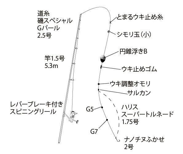 ここは奥まった地形の岸壁だけに、際はあまり流れないだろうから、釣り方は沈め釣りで、竿は1.5号の5.3m、レバーブレーキ付きのスピニングリールに、道糸は2.5号、ハリスは1・75号(2ヒロ)。針はナノチヌふかせ2号。