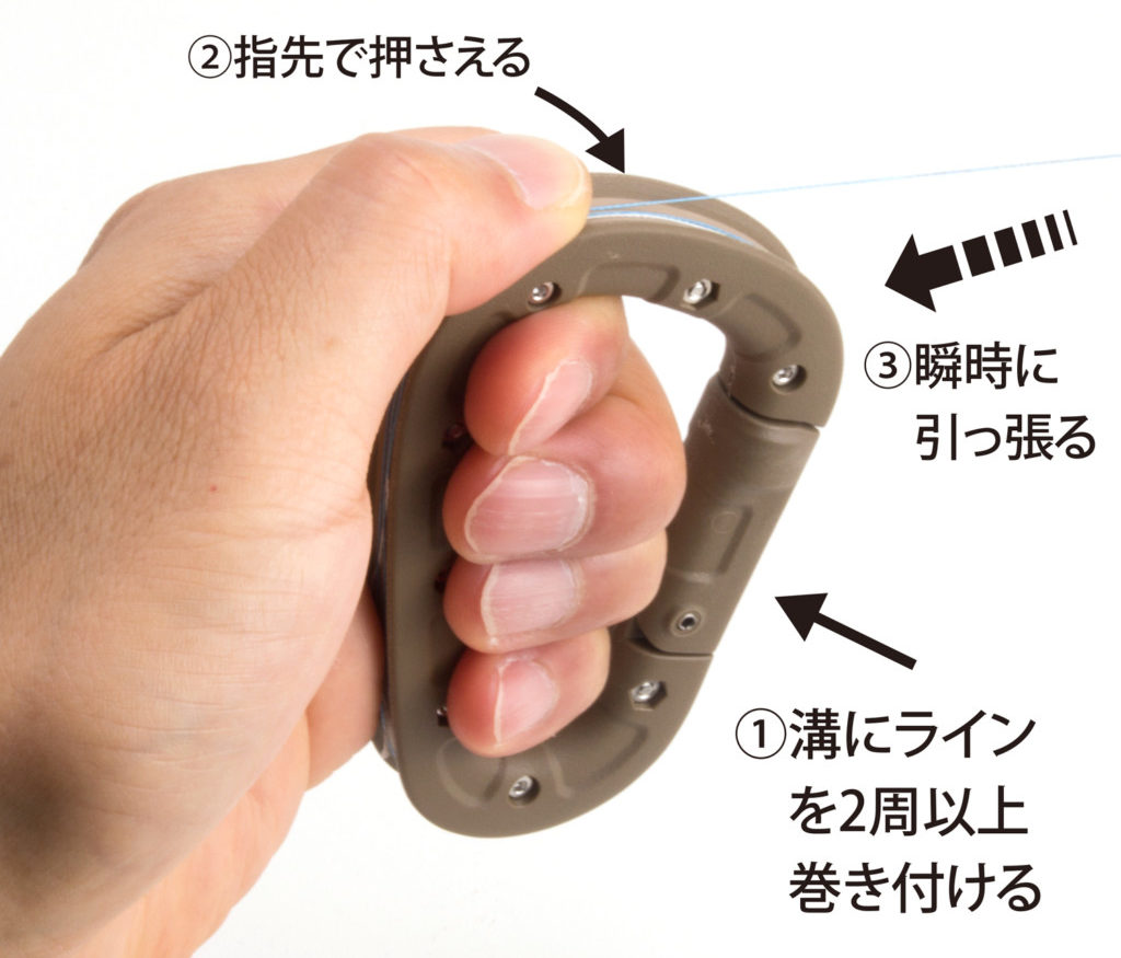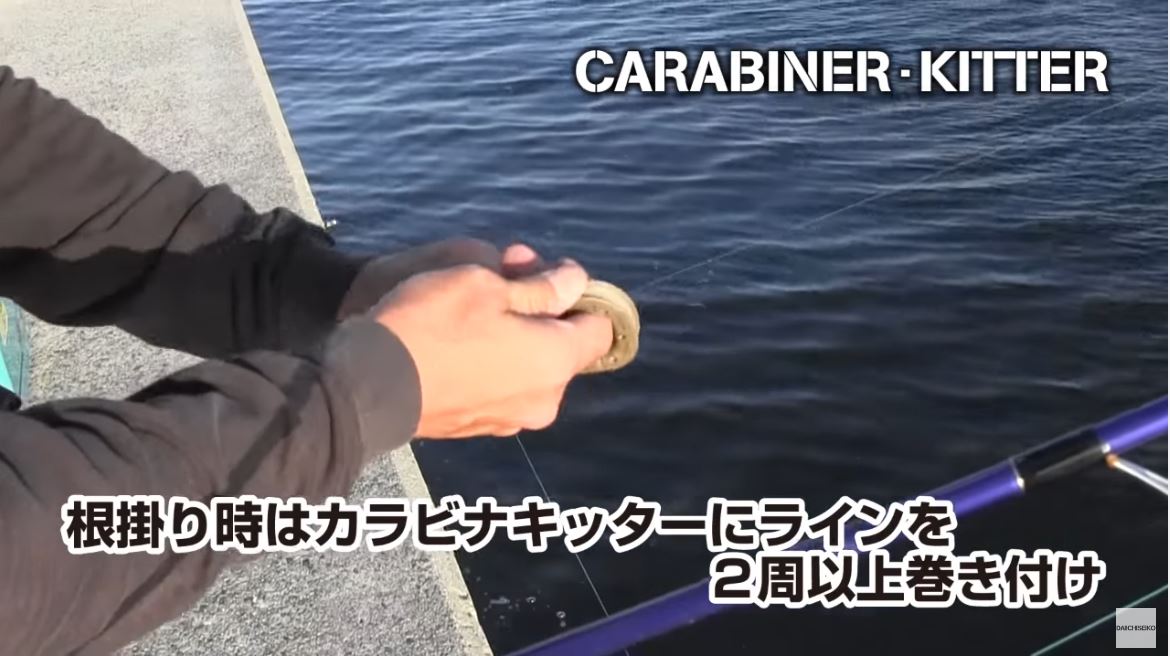 使い方は、根掛かりしたらラインをカラビナキッターに2周以上巻き付けます。親指でラインを押さえながら、引っ張ります。