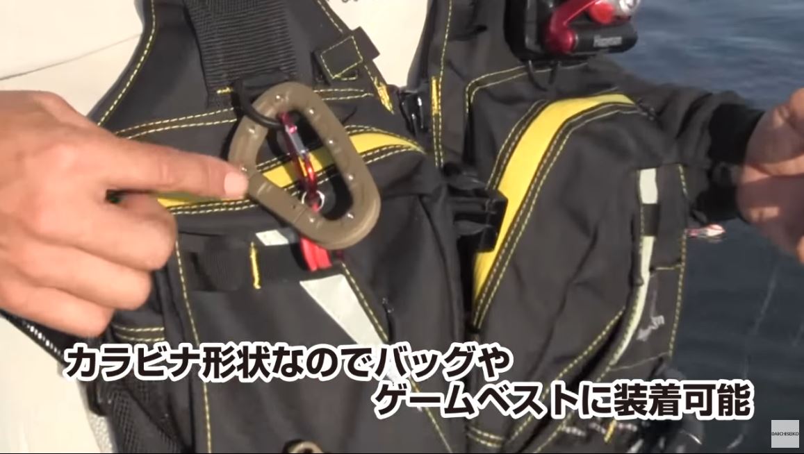 ショア専用のカラビナキッター、必然的に携行性を必要とします。カラビナキッターはその名の通り、カラビナとなっているので、ベストやバッグ、ベルトなどに装着して持ち運びすることができます。