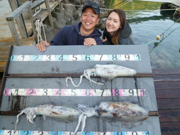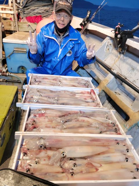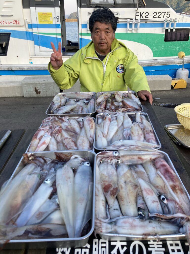 小浜沖ではマイカがイイ感じ。半夜便ではよい人50パイオーバー、オールナイト便では少ない人でも30パイ超、よい人は80パイ近い大釣りもありました。