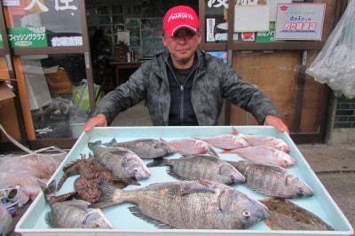 高浜沖では胴突き仕かけで五目が土産十分。25~35cmと型揃いのレンコダイがよい人50尾オーバーの日もあり、五目釣りなら船中全員土産は確実です。ほか、まじりモノではマダイ、チダイ、ハマチ、アジ、ウマヅラハギの姿もありました。