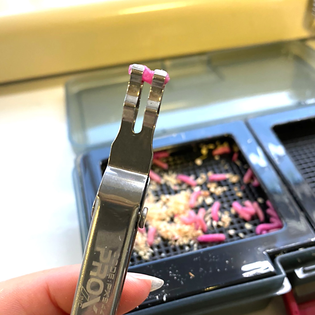 小さなエサから大きめのエサまで、潰さないようにしっかりと挟み込めるので、虫エサに触らずにエサを付けたり、カットしたりすることができます。