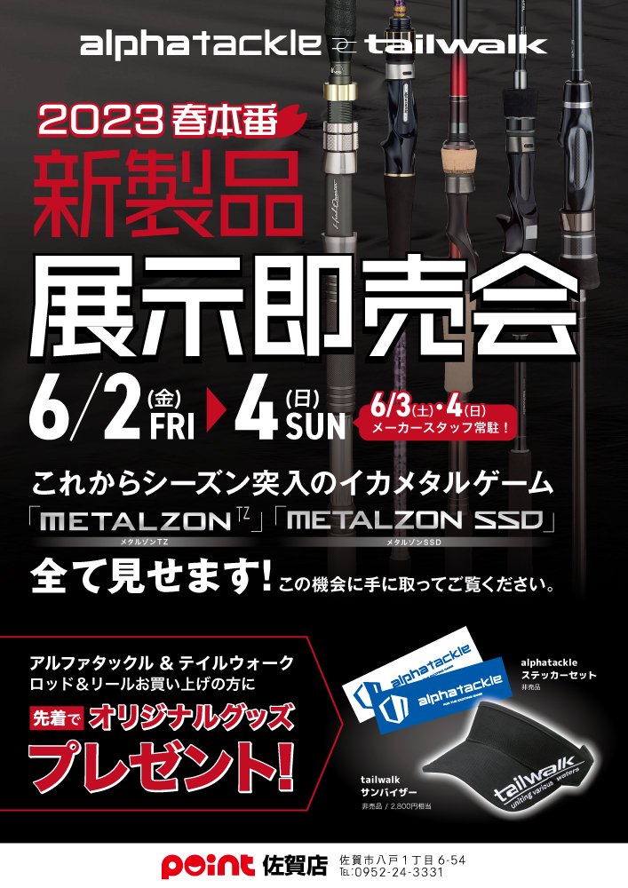 釣具のポイント佐賀店にて、アルファタックル&テイルウォークの新製品展示即売会が開催されます。
