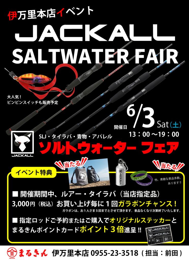 伊万里本店では6月3日に「ジャッカル ソルトウォーターフェア」が開催されます。