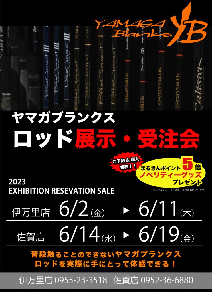 伊万里店と佐賀店の2店舗でヤマガブランクスのロッド展示・受注会が開催されます。