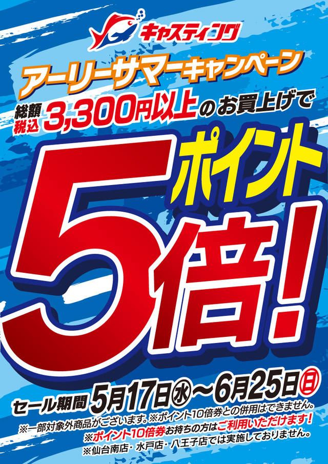 5/17(水)~6/25(日)の期間中、総額税込3,300円以上のお買い上げで《ポイント5倍》プレゼント! ここでキャスティングポイントを一気にためるチャンスです!!