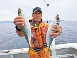 生きエサのアコウ主体の根魚狙いは、いぜん好調キープ。アコウだけで1人2ケタ釣果も続出しており、これにガシラなどもまじってくるので土産は十分。サイズも40cmオーバーの大型がよく上がっており、型、数狙える絶好のシーズンとなっています。エサのサイズ次第では、ヒラメにも期待ができます。