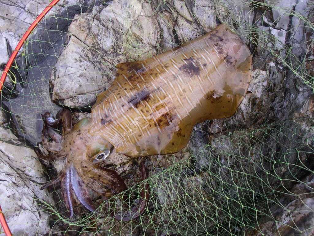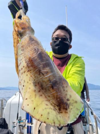 敦賀沖では日中のエギングで大型アオリイカが続々と上がっています。2kg級の大型を頭にキロアップ主体でよい人4ハイ、船中10パイの日もあり、この日はビギナーにも複数ハイ釣れたそうです。