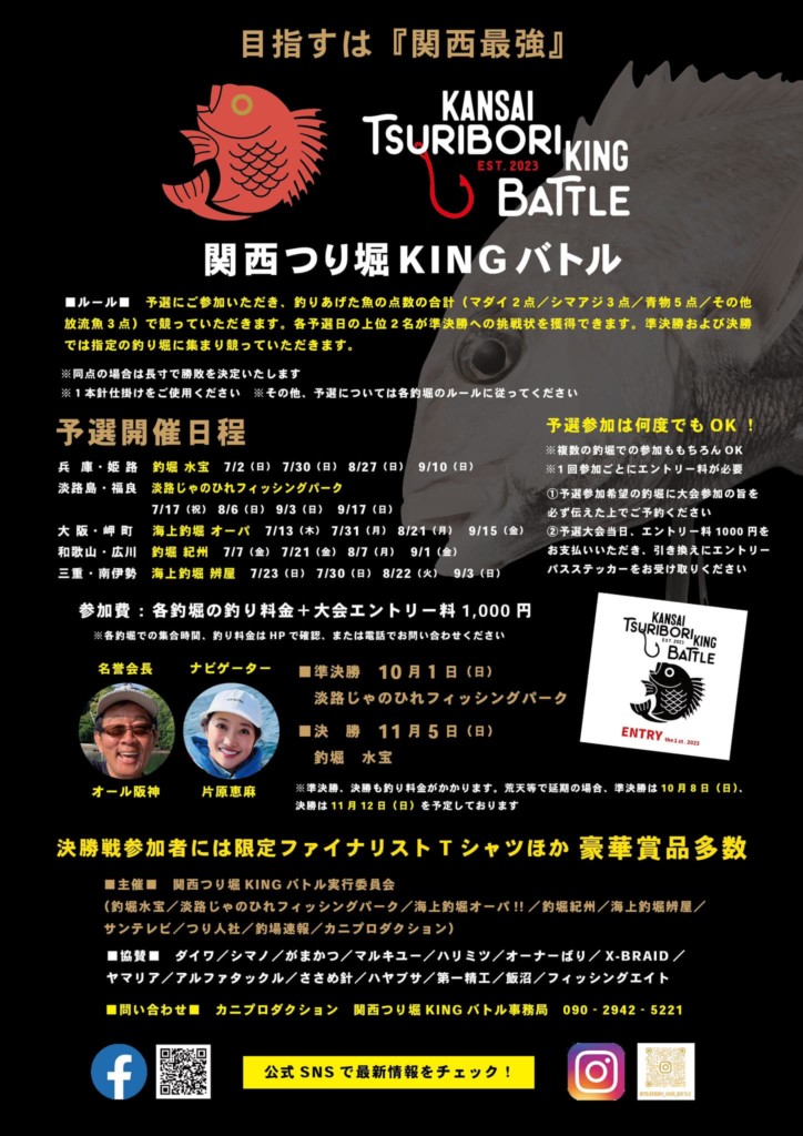 7月2日から大阪・兵庫・和歌山・三重の5か所の釣り堀で約20回の予選が行われます。10月の準決勝、11月の決勝へ駒を進め、KINGが決定します。
