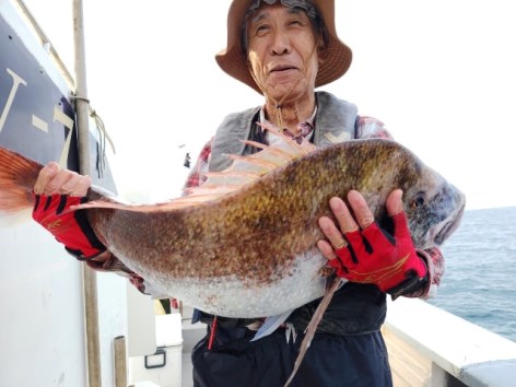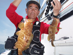 生きエサのアコウ根魚狙いは、いぜん絶好調が続いています。サイズは40cmオーバーの大型もよくまじっており、よい人は連日ツ抜け。中には20尾前後上げる人もいます。ゲストでガシラ、アオハタ、ヒラメ、ソイなどもまじっているので、今ならビギナーでも合わせて土産は確実と言っても過言ではないほどです。