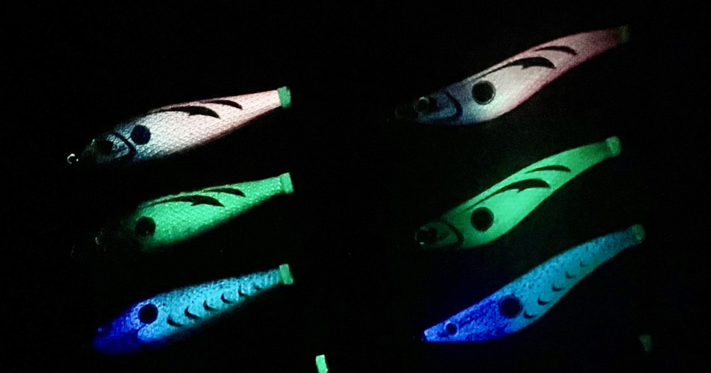 イカの活性が高いシーンでは、アピール力の高い「夜光パープルピンク」、「夜光グリーングリーン」、「ブルー夜光パープルイエロー」を使用。