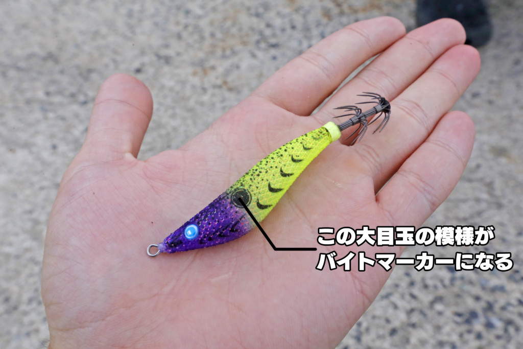夜になると大きな目玉のシルエットが、くっきりと浮かび上がります。その目の模様がバイトマーカーになり、その場所めがけて抱いてくる。あとはアワセるだけで自動的にバレにくい口付近にスライドし、キャッチ率が上がるという仕組みとなっています。