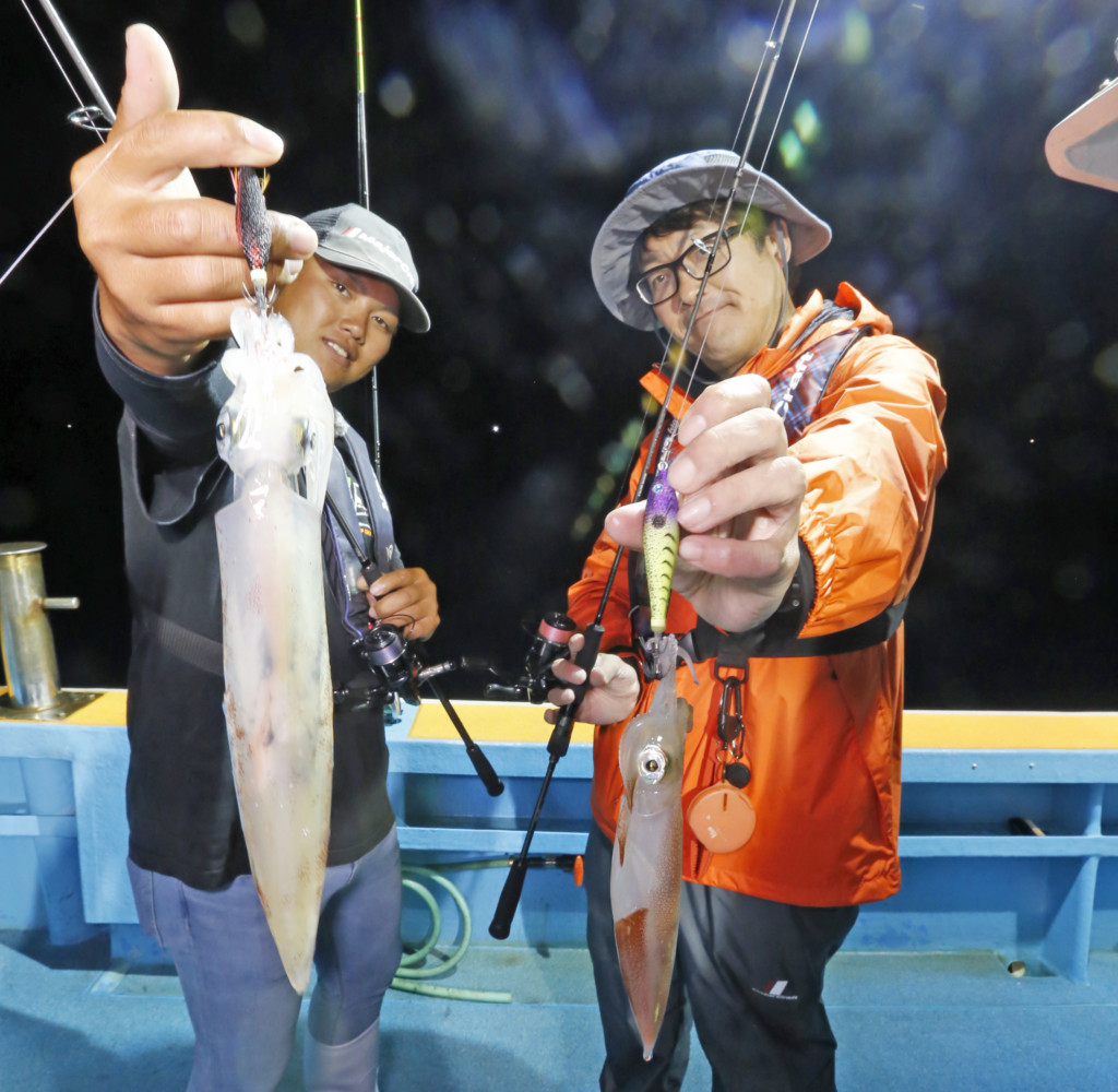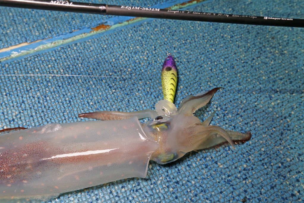 柴田氏がイカメタル、マサ船長がオモリグを使って釣りをしたのですが、引き込むようなアタリ、フォールでフッと止まるアタリ、ティップが揺れる繊細なアタリもしっかりフッキング!