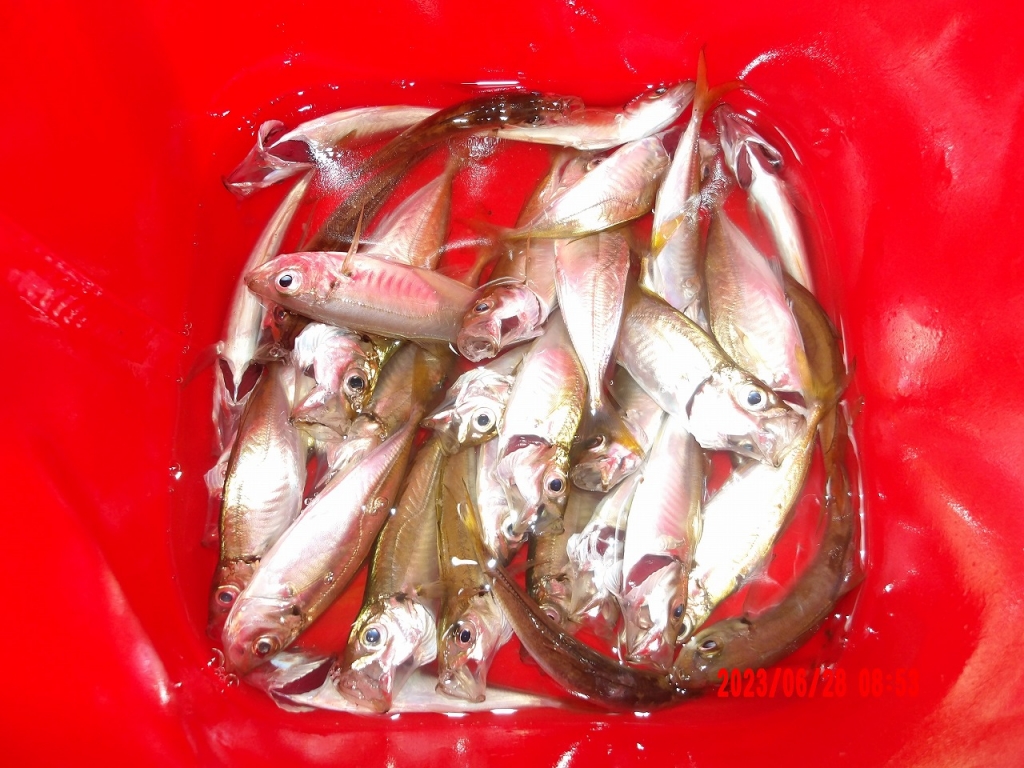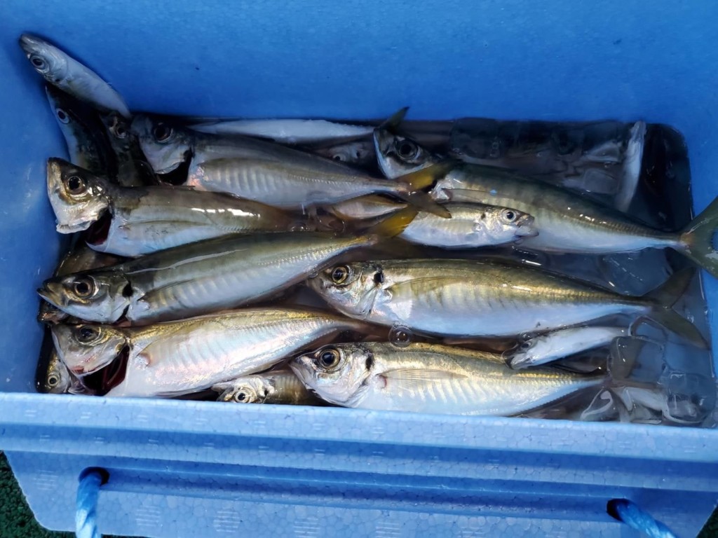 豆アジ6040尾、クロ10~29cm86尾、アジ20~27cm61尾、アオリイカ1000gと300g、小サバ2530尾、チヌ40~51cm5尾、ヒラメ30~37cm6尾、ヤズ26~38cm5尾、イシダイ33cm、スズキ40~64cmなど。