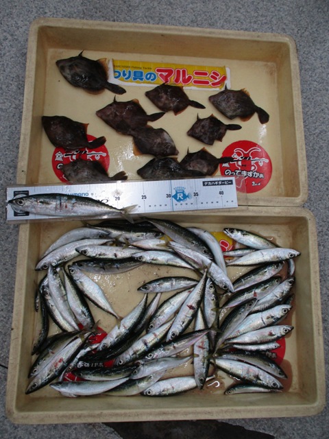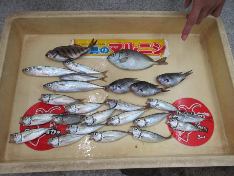 雑賀崎のサビキ、胴突き釣りでカワハギ、小サバ、イワシなど、田ノ浦のサビキ釣りで小サバ、アジ、スズメダイなど、輝北沖のアジングでアジ30cm超11尾。