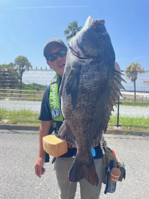 南港魚つり園護岸でスタッフがチヌ52.5cmをイ貝の落とし込み釣りで。