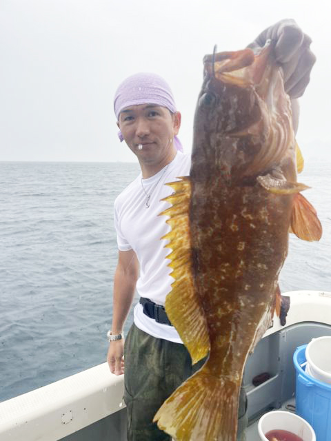 生きエサのアコウ根魚狙いは、いぜん最大50cm級の超大型アコウもまじって好調に上がっています。中には仲間内で40cm以下のアコウはリリースという特別ルールを作っての釣りでも、各自40cmオーバーのアコウで土産十分の日もありました。連日よい人は2ケタ釣果確実で、これにガシラ、ヒラメ、メバル、アオハタなどもまじります。