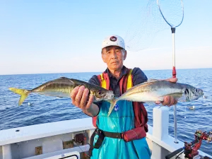 中浜沖のフカセ釣りでは、メジロ70cm級、良型マダイなどの大物釣りが楽しめます。ほかにイサギ35~45cm、グレ35~50cmなどもよく上がって土産になっています。潮次第では、ヒラマサもまじるので魅力十分です。