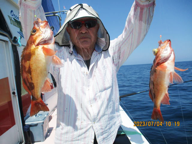生きエサでのノマセ釣りは、アコウの30cm前後が数上がっており、これにガシラ20cm前後、メバル28cm前後、アオハタ40cm前後なども上がって土産になっています。