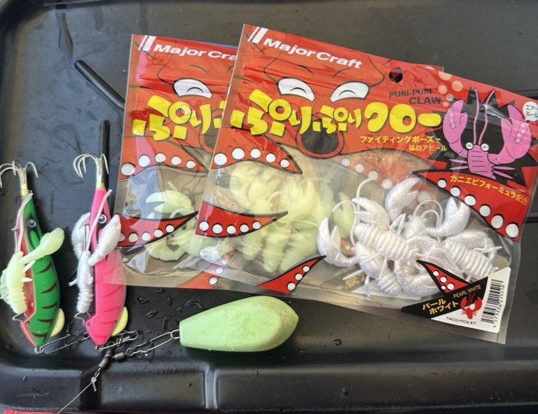 ジグパラマン曰く、「シルエット小さくできるぷりぷりクロー(別売)チューンをしたり、カニワームの色を変えたり、最終兵器エサチューンができてパターンに合わせやすいぷりぷりタコクラブの方が反応がよかったと思います」とのこと。