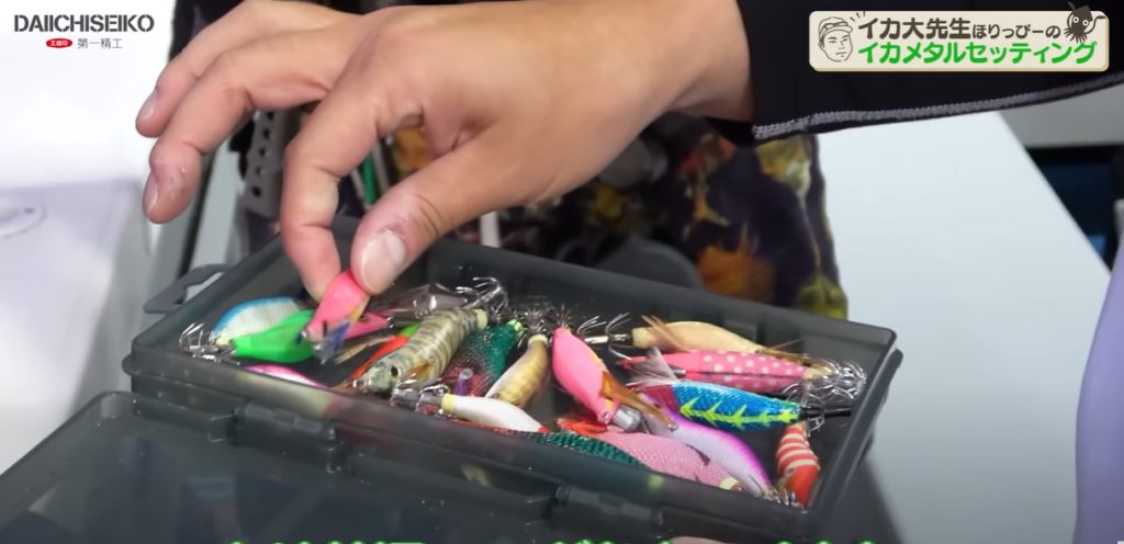 先日公開されたイカメタルの動画でも使用されていました。深さがエギに丁度よく、上下に重なったりしにくいから、お互いキズつけることなく保管できるとのこと。
