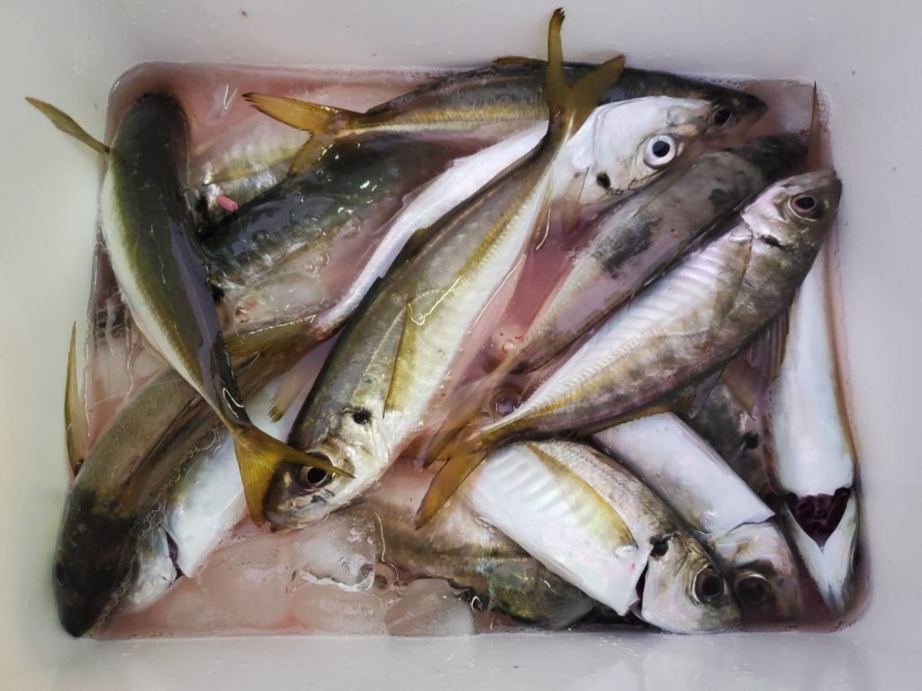 アジ26cm頭に多数、サバ22cm頭に多数、トウゴロウイワシ14cm頭に多数、ウルメイワシ16cm頭に多数、メジナ25cm頭に8尾、セイゴ32㎝頭に2尾、ネリゴ30cm頭に2尾、カサゴ25cm頭に13尾、オコゼ28cm、キジハタ22cm、キス23cm頭に8尾、ヘダイ44cm、マゴチ57.6cm、ヤズ37cm頭に7尾。