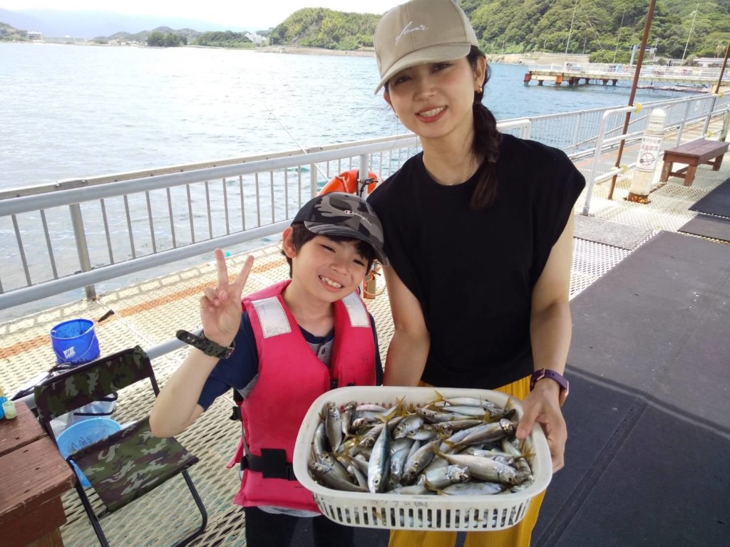 アジ18cm頭に多数、マダイ22cm頭に3尾、サバ15cm頭に100尾、チヌ35cm頭に2尾、セイゴ60cm。
