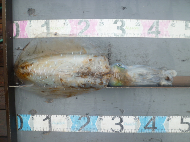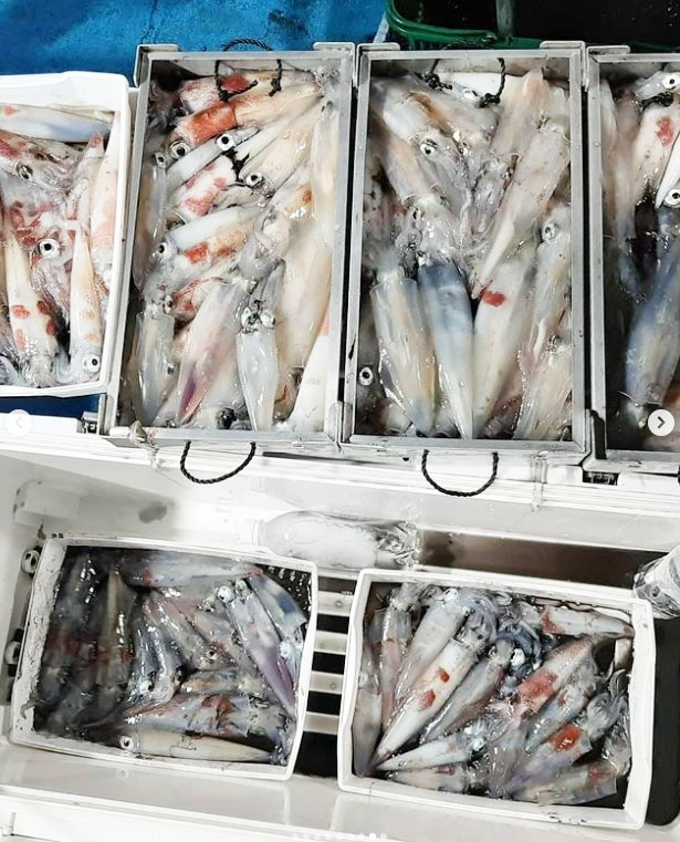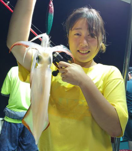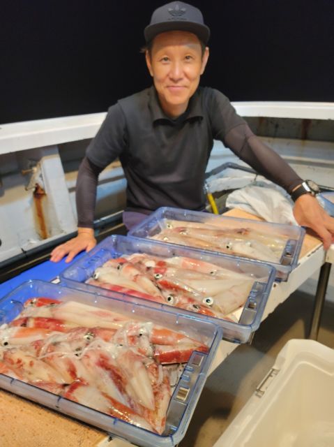 沖釣りは、海況よい日にはマイカの大釣りが出ています。オールナイト便では、トップ100パイ前後の日を頭に、よい人50~70パイの日も多々。深夜便でも数は上がっています。サイズは胴長10~30cmとバラつきがあるようです。