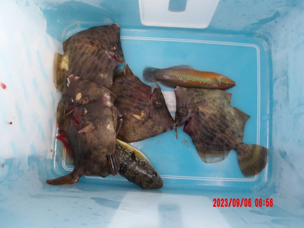 アジ25cm頭に69尾、マダイ20cm頭に8尾、ネリゴ30cm、カワハギ33cm頭に20尾、チヌ33cm頭に2尾。